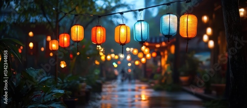 Naklejka premium Rainy Night Asian Alleyway Lanterns