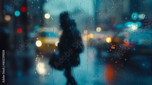 Obraz premium Rainy Night City Street Scene Blurry Silhouette of Person Walking, Dark and...