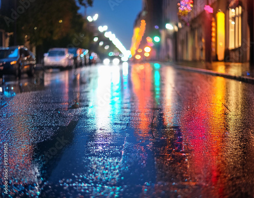 © Beste stock, Obraz premium Rainy Night City Street with Colorful Lights Reflecting on Wet Pavement