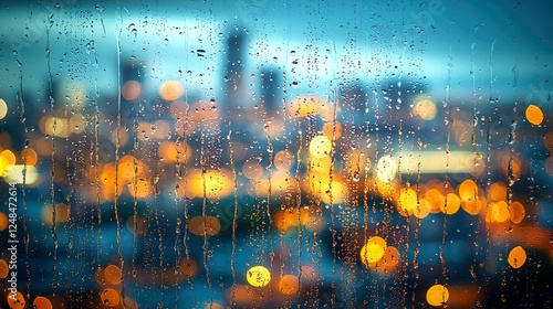 © Hammam, Obraz premium Rainy Night Cityscape: Captivating View Through a Rain-Streaked Window. Urban Lights Blurred by Falling Water Drops, Creating a Dreamy, Atmospheric Scene.