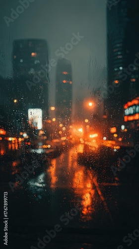 Obraz premium Rainy Night Cityscape Through A Wet Window