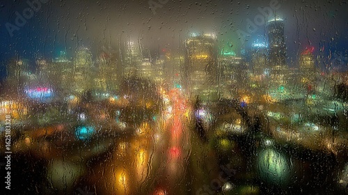 © Alamisme, Naklejka premium Rainy Night Cityscape Through Wet Window