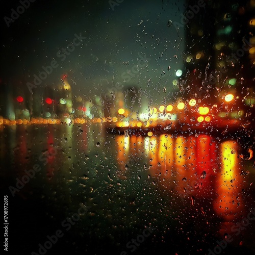 © Al, Fototapeta premium Rainy Night Cityscape Through Window