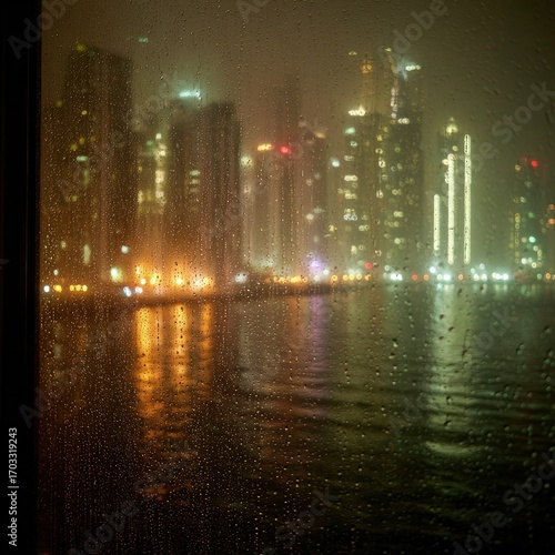 © Al, Fototapeta premium Rainy Night Cityscape View Through Wet Window