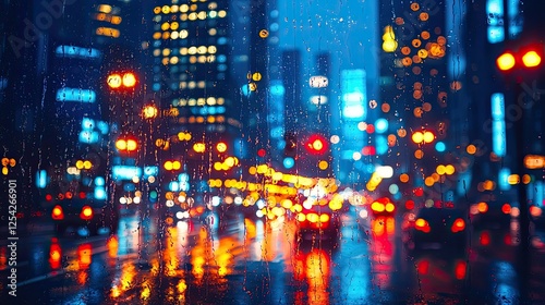 © Putri, Obraz premium Rainy Night Cityscape Viewed Through Wet Window