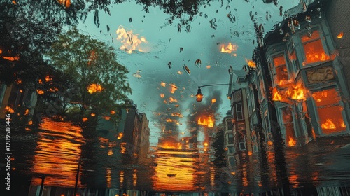 Obraz premium Rainy night, fire reflection, urban puddle.