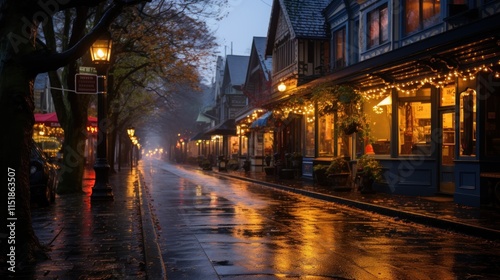Naklejka premium Rainy Night in a Charming Town: A Captivating Street Scene