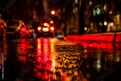Obraz premium Rainy night in the big city, alley between houses with a car traveling. View from the level of asphalt