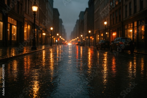 © Tati, Fototapeta premium Rainy night on city street with wet pavement illuminated by streetlights