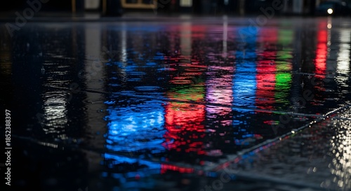 Obraz premium Rainy night reflection of vibrant colorful lights on a wet city pavement