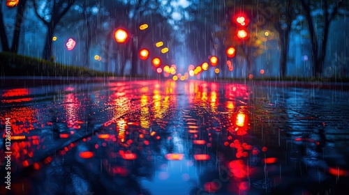 © harryaishi, Fototapeta premium Rainy night street, bokeh lights reflections.