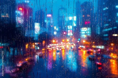 © pavlofox, Naklejka premium Rainy night view of a vibrant city street with blurred lights