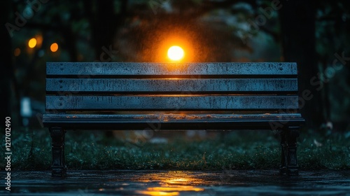 Obraz premium Rainy park bench, night light, calm