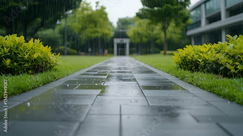© artzone, Fototapeta premium Rainy Pathway Through Park Landscaping