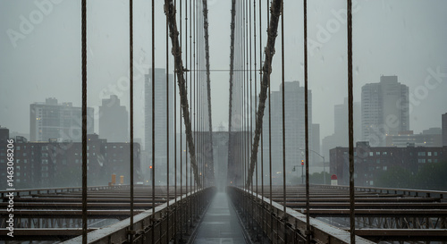 © SINGGIH, Obraz premium Rainy Perspective View Of Brooklyn Bridge Steel Cables Against Skyline