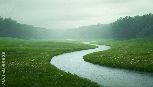 Naklejka premium Rainy River with Green Meadow Landscape.
