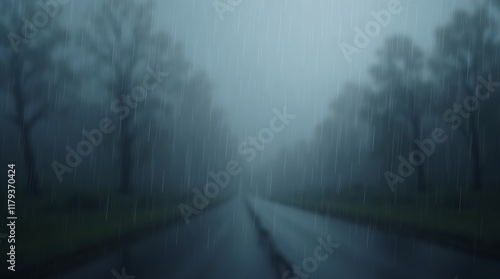 Obraz premium Rainy Road, Gloomy Atmosphere, Trees in the Mist