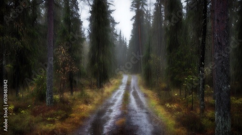 Obraz premium Rainy road through a forest landscape
