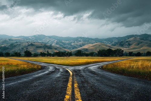 © BISO, Naklejka premium Rainy scene with intersecting country roads and grey sky
