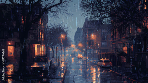 © Ky, Naklejka premium Rainy Streets Pixel Art