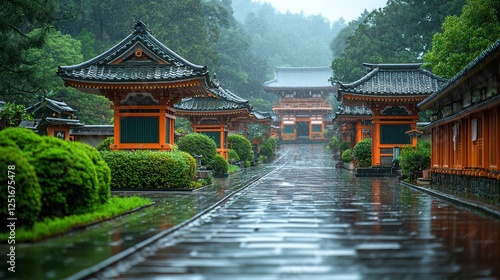 Fototapeta premium Rainy Temple Path, Japan, serene, misty mountains
