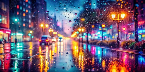 Fototapeta premium Rainy Twilight Street Neon Lights Watercolor Double Exposure Stock Photo