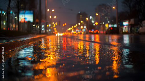 Fototapeta premium Rainy urban street at night with glowing reflections and blurred lights...