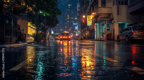 Fototapeta premium Rainy urban street with reflections and glowing lights