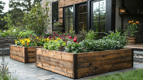 Naklejka premium Raised Garden Beds with Wooden Planters: Backyard Garden Design Ideas