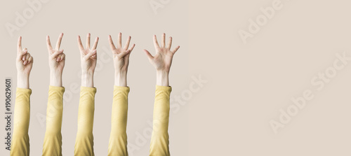 © sebra, Fototapeta premium Raised up hands and fingers showing numerical