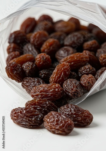 © Manji, Fototapeta premium Raisins Spilling From a Plastic Bag on White Surface Close Up