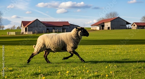© Kirigakure, Obraz premium Ram Running in Green Pasture on a Farm.