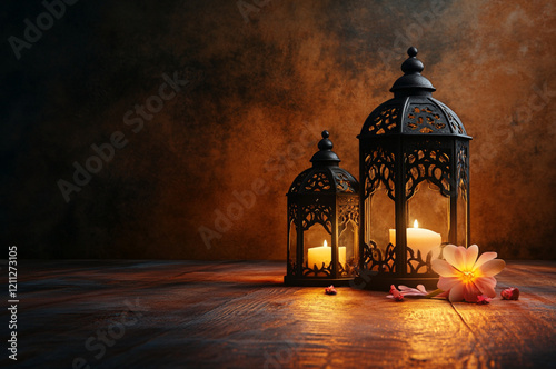 © Eva, Fototapeta premium Ramadan background, in a color palette of black and warm tones, with ample copy space for text and graphics. The scene depicts a night-time setting with three beautiful lanterns on the floor