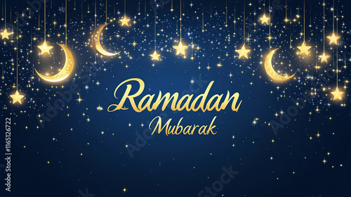 Fototapeta premium Ramadan Banner with Oriental Lanterns and Crescent Moon on Night Blue Background