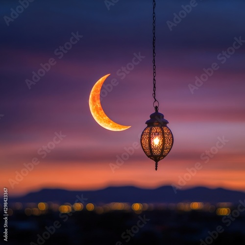 © Priya, Obraz premium ramadan crescent moon and lantern at sunset