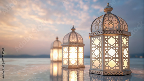 Fototapeta premium Ramadan decor visual. Elegant lanterns glow warmly at sunset, reflecting on...