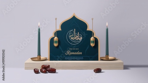 © Media Srock, Obraz premium Ramadan Decor with Candles Dates and Lanterns