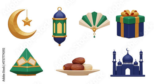 Fototapeta premium Ramadan Elements - Crescent Moon, Lantern, Fan, Gift, Pyramid, Dates, and Mosque.
