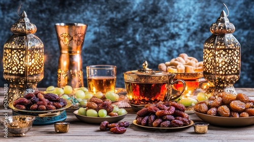 Fototapeta premium Ramadan feast dates, tea, lanterns, wooden table, celebration