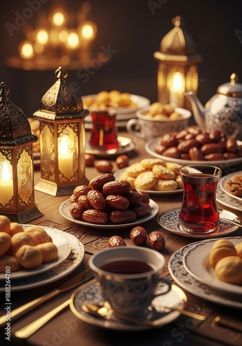 Obraz premium Ramadan Feast Table with Lanterns and Dates in Warm Light