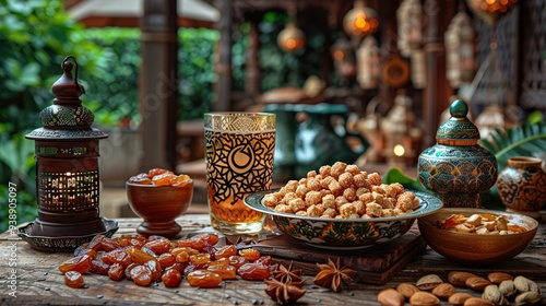 Fototapeta premium Ramadan Kareem card template with dried dates in an Islamic star and crescent bowl, wooden lantern, nuts, and a cup of tea on the table.