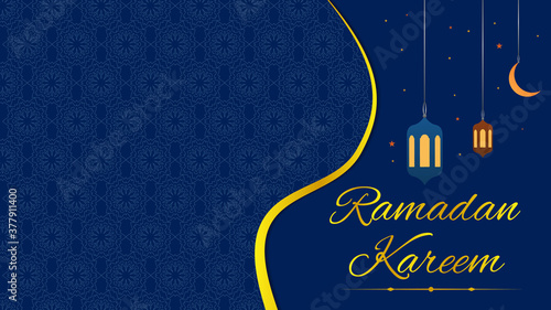 Fototapeta premium Ramadan kareem eastern pattern lamps moon stars blue yellow illustration...