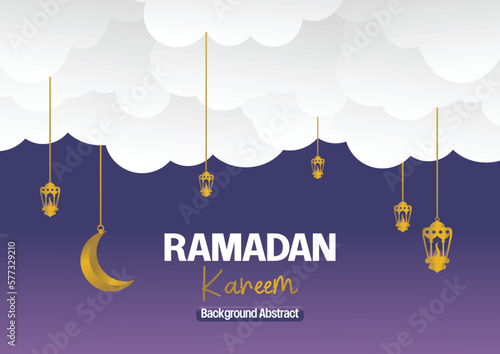 © Akhmad, Naklejka premium Ramadan Kareem greeting banner or card design with paper cut ornament of islamic lanterns, moon in golden color. Vector illustration, Place for text