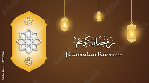 © Hunia Studio, Naklejka premium Ramadan kareem greeting card template with gold ramadan lantern, islamic background banner wallpaper vector illustration. Arabic text translation : ramadan kareem, holy month for muslim