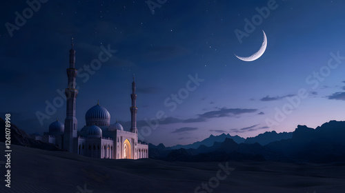 © fadi, Fototapeta premium Ramadan Kareem greeting. Islamic crescent moon and mosque. End of fasting. ramadan decorations, Eid al-Fitr. Breaking of holy fast day. Muslim holiday. Arab night sky.
