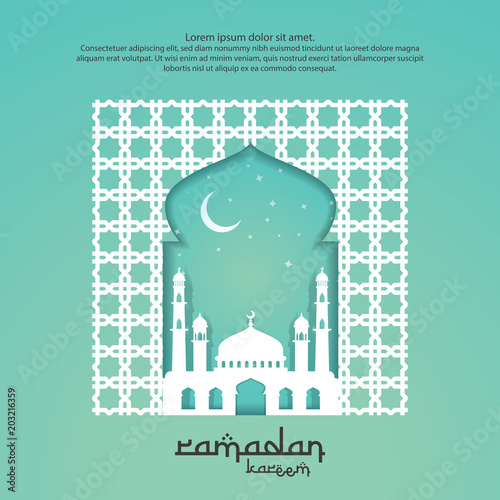 © 200degrees, Naklejka premium Ramadan Kareem islamic greeting card design with 3D dome mosque, door or window, and pattern element. paper cut background style. Vector illustration.