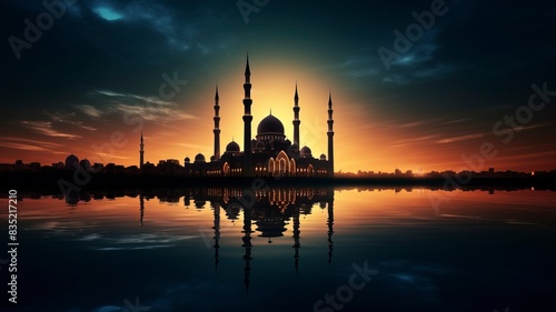 © Dzikrul Husnani, Fototapeta premium Ramadan Kareem religious background with mosque silhouettes reflected in serene sea, copy space, generative ai