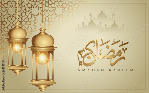 Naklejka premium Ramadan kareem with golden luxurious crescent moon and lantern, template islamic ornate greeting card vector