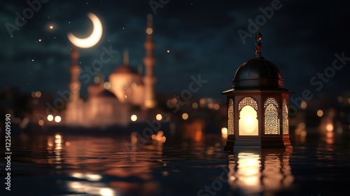 Fototapeta premium Ramadan Lantern Floating on Water at Night with Mosque