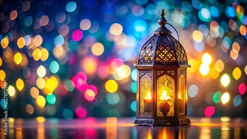 Fototapeta premium Ramadan Lantern Glowing Against City Bokeh Lights